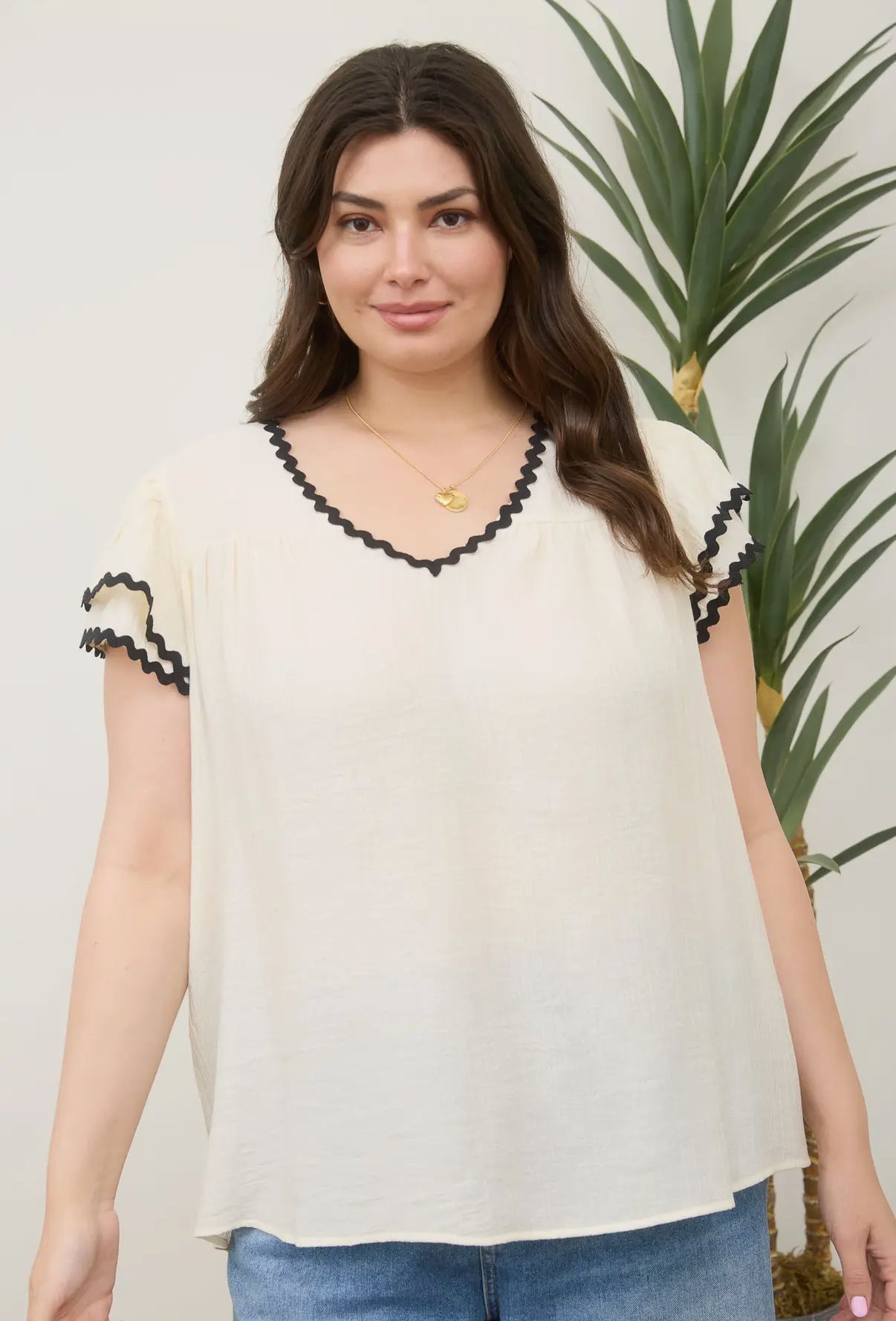 Elevate your wardrobe with this refined woven top, featuring a flattering V neckline and delicate short ruffle sleeves with layered detailing. The wavy trim and contrasting accents add visual interest while maintaining a polished aesthetic. Crafted in a solid cream and black colorway, this unlined piece offers breathable comfort and versatile styling for both casual and elevated occasions.